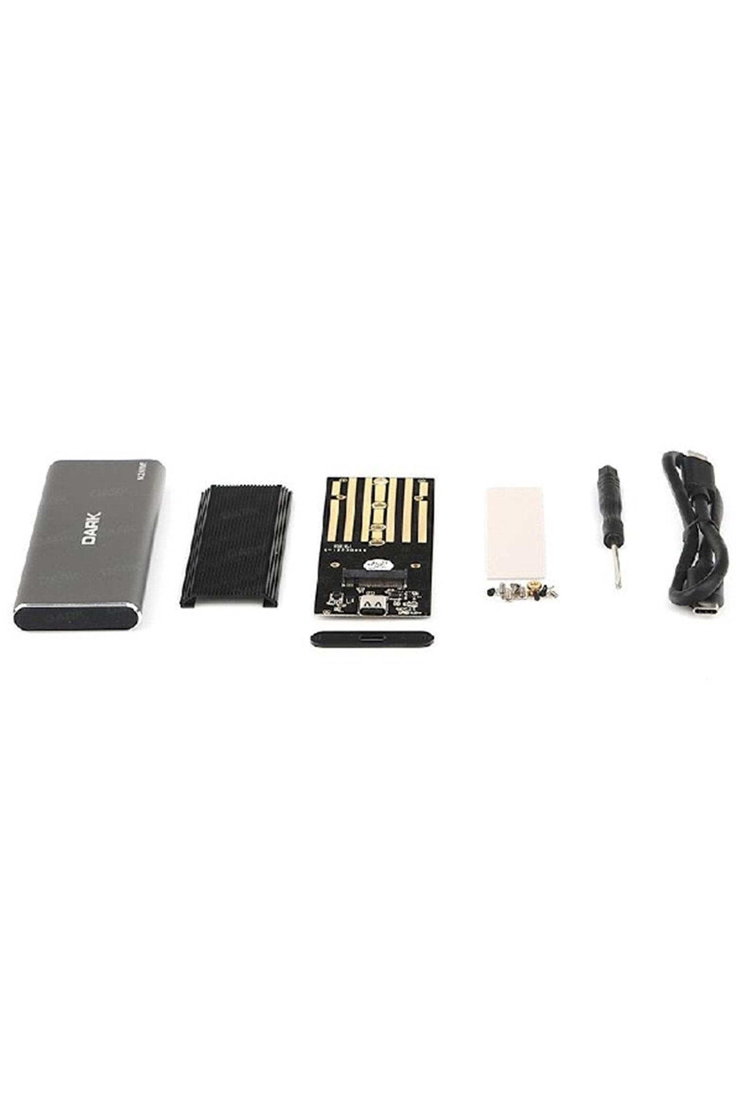 Dark NVMe M.2 disk kutusu ile kapasite ve kalınlık farkı gözetmeden 30/42/60/80mm uzunluğundaki M.2 NVMe diskleri güvenle kullanabilirsiniz.